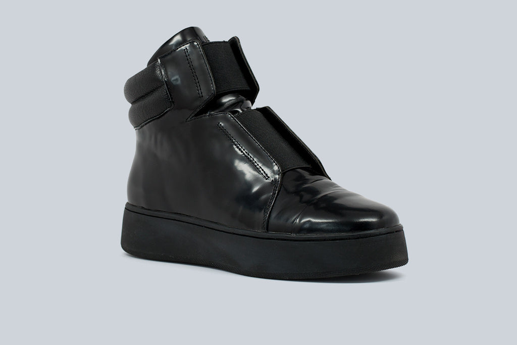 Platform quilted double elastic futuristic high-top sneaker in shiny leather.