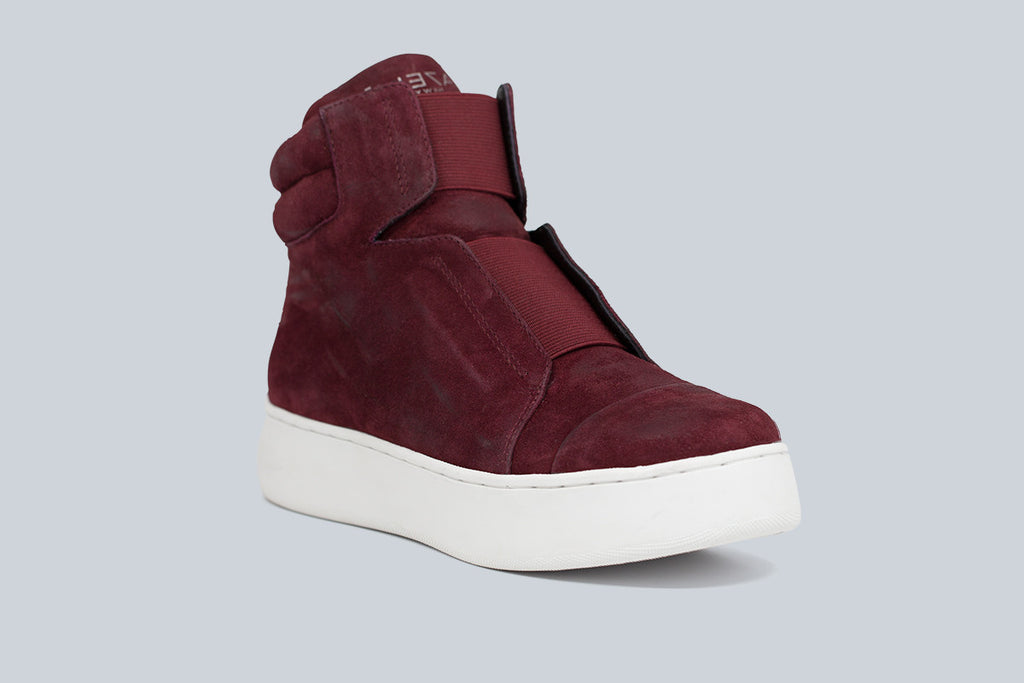 Platform quilted double elastic futuristic high-top sneaker in waxy suede.