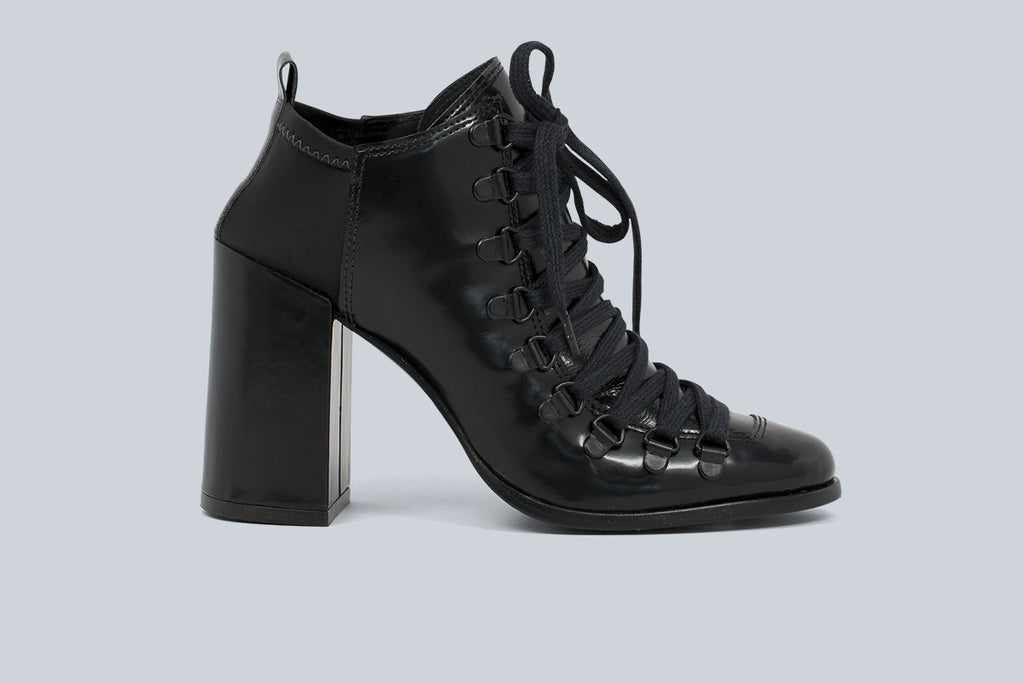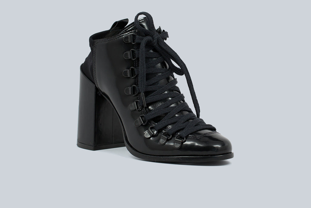 90mm Corseted patent leather hiking ankle bootie with form fitting neoprene.