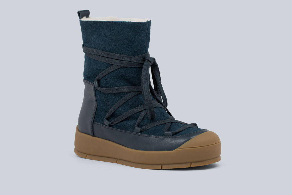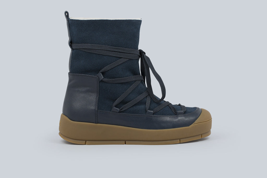 Apres ski racer platform bootie. Shearling lined slip on with corseted lace detail in leather and suede.