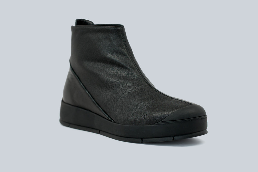 Racer platform ankle boot. Shearling lined with rear back zipper in pebble leather.