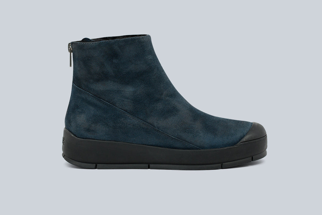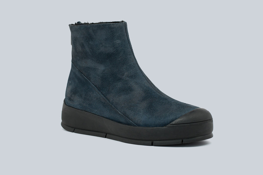 Racer platform ankle boot. Shearling lined with rear back zipper in waxy suede.
