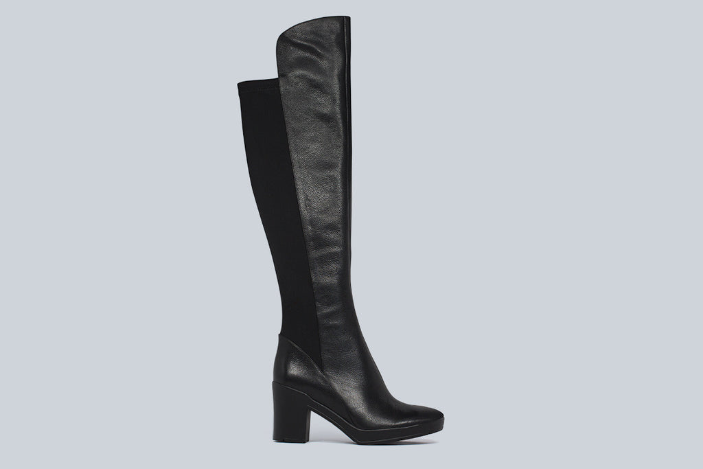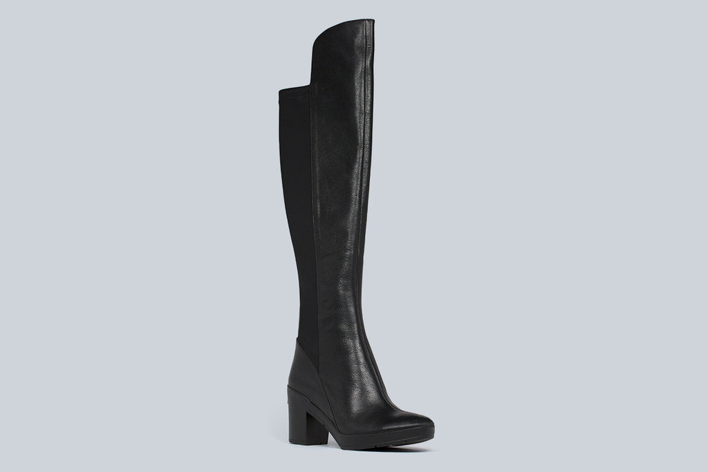 Flexible rubberized heel over the knee boot with form fitting neoprene back in pebble leather.