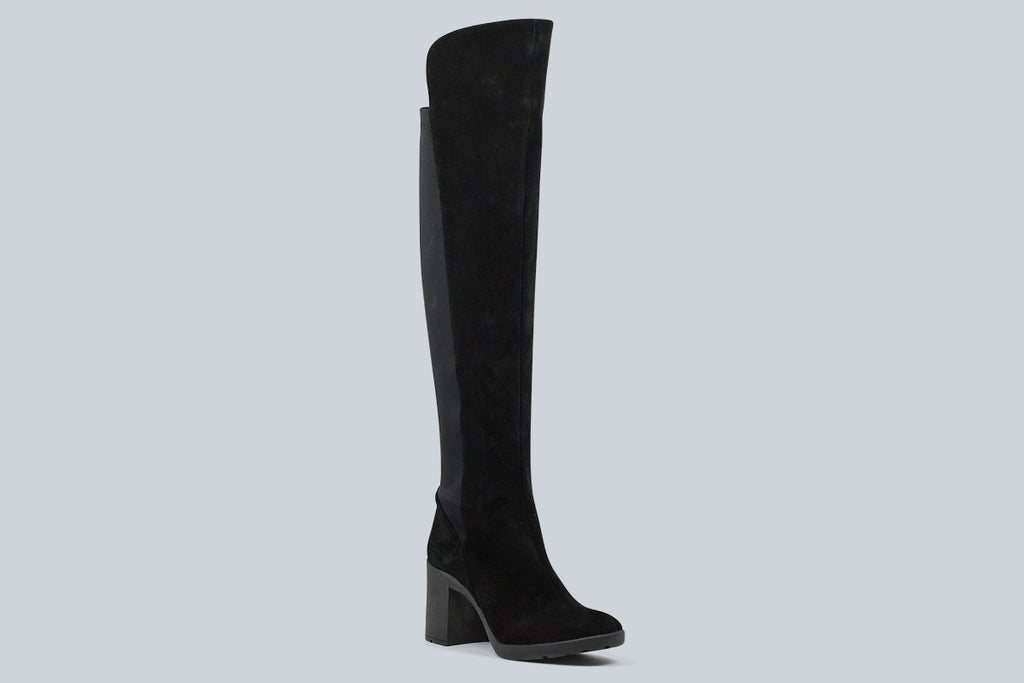 Flexible rubberized heel over the knee boot with form fitting neoprene back in suede.