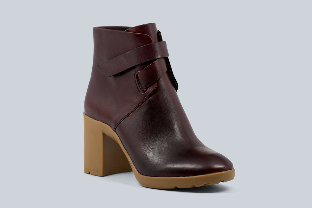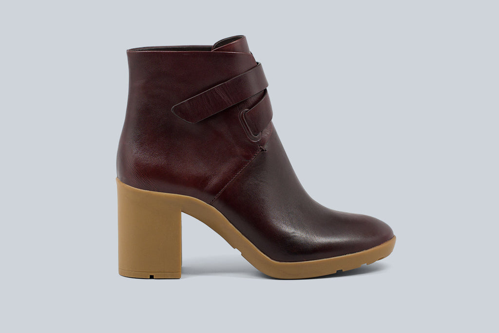 Flexible rubberized heel ankle bootie with crisscross closure detail in calf leather.