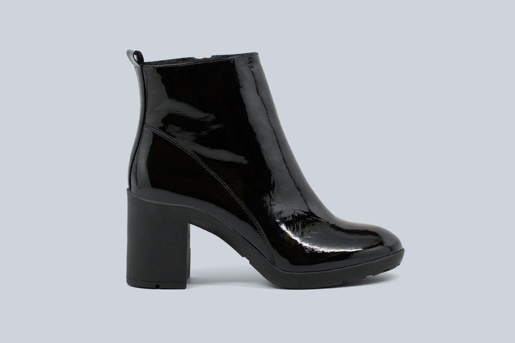Flexible rubberized heel, patent leather ankle bootie with shearling lining.
