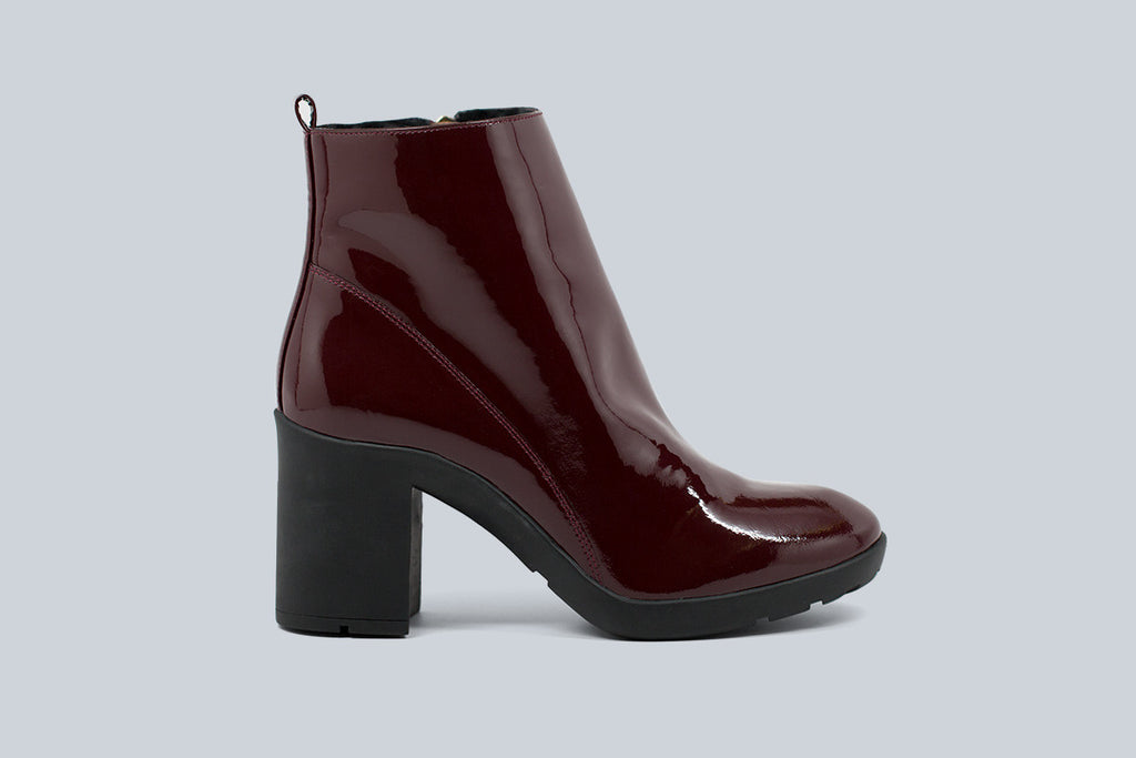 Flexible rubberized heel, patent leather ankle bootie with shearling lining.